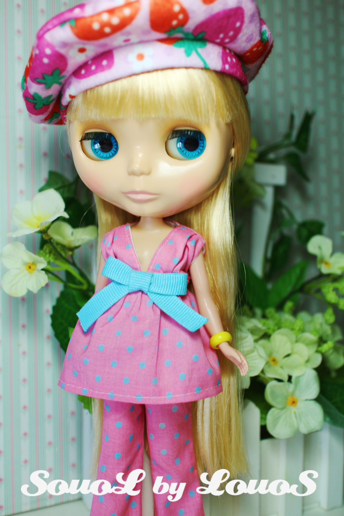 - V-neck polka dot top with flounce, decorated with corded ribbon on front, lined, closes at back with snap buttons.