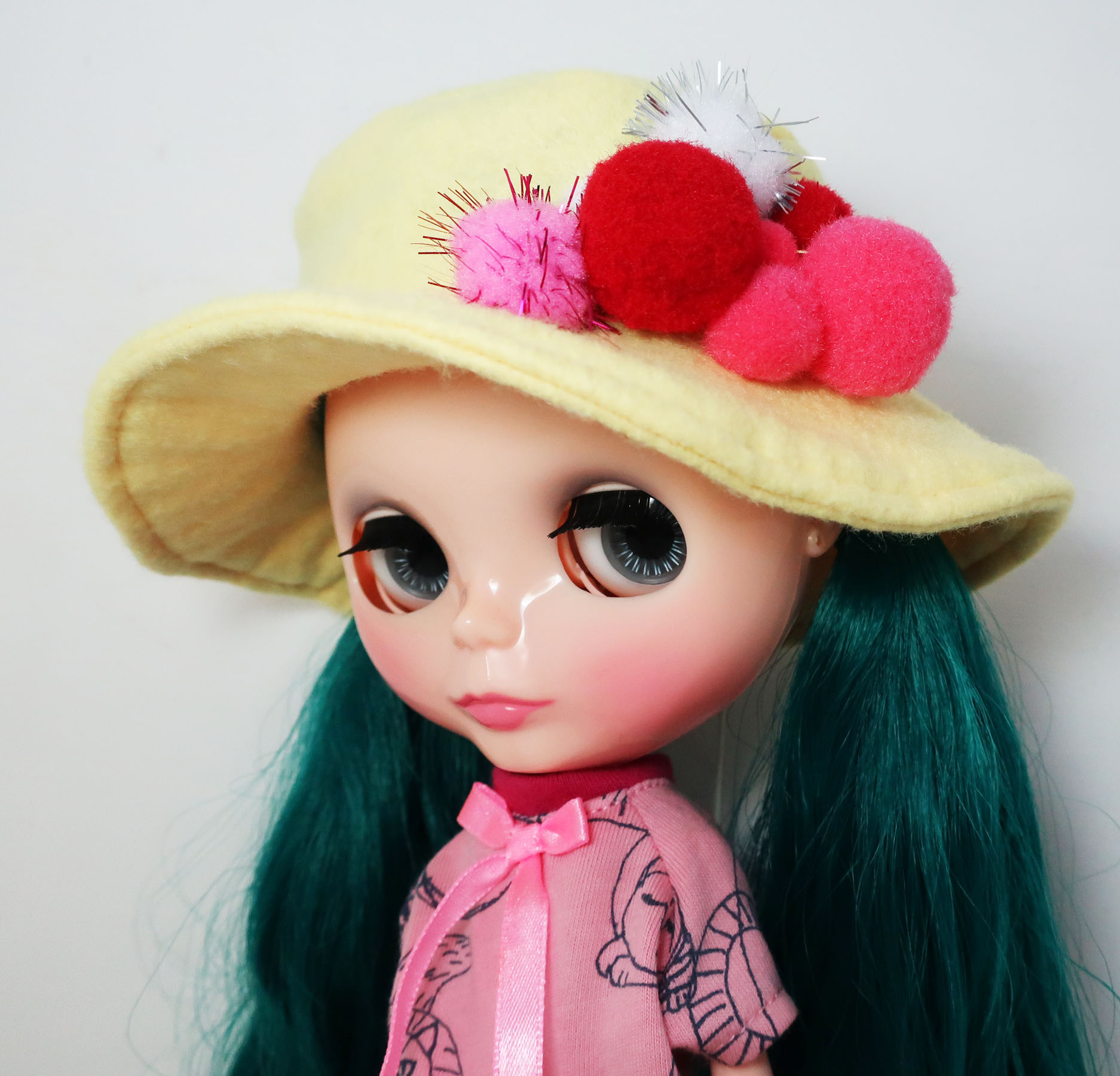 - Felt sun hat decorated with mutli-coloured pom poms.