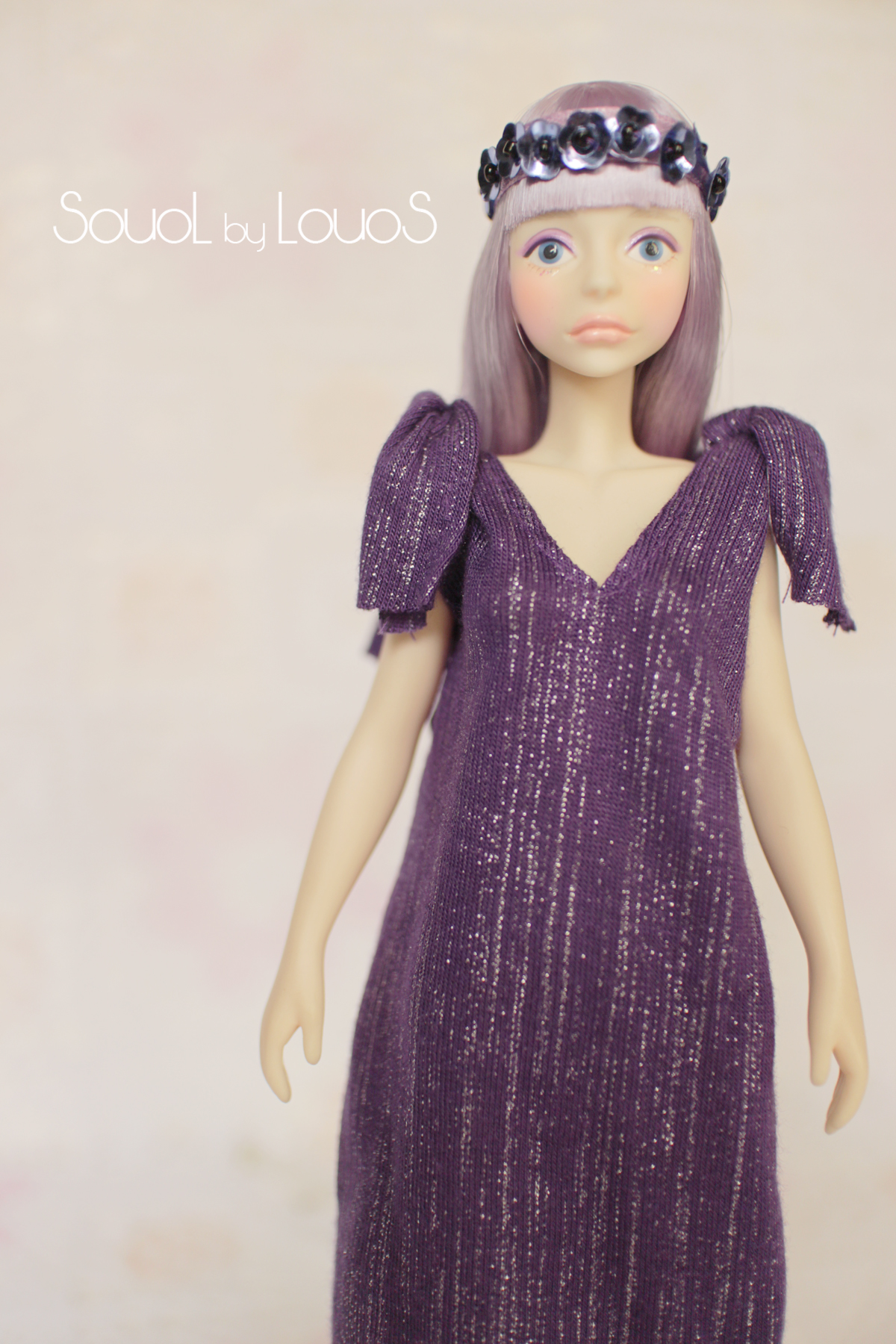 - Glitter jersey v-neck dress with tie details on shoulder, worn over head.