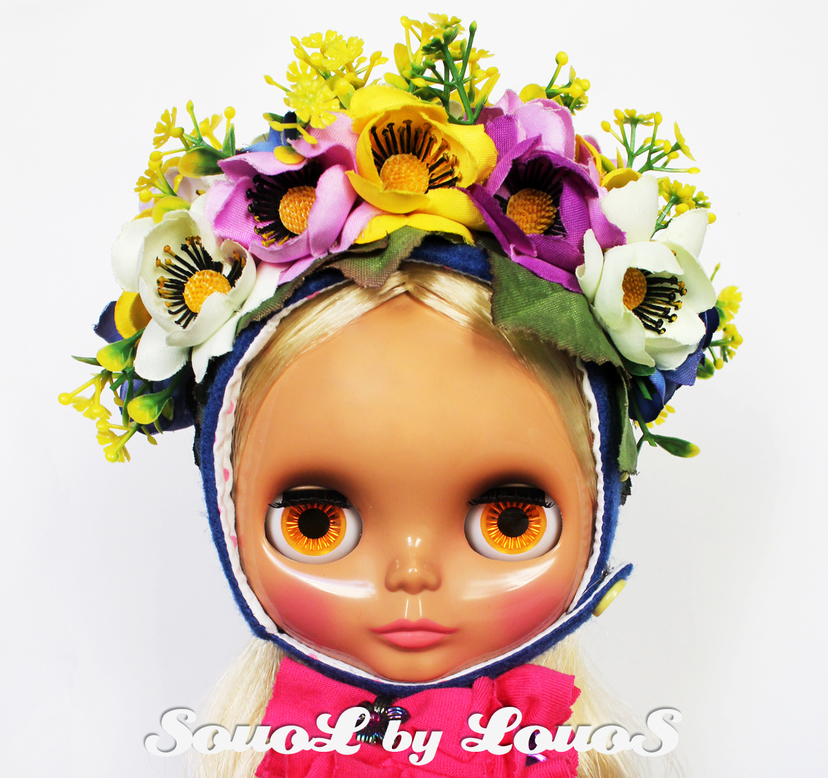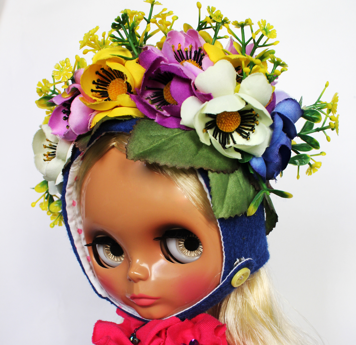 - OOAK flora bouquet helmet, lined, closes with a snap button chin strap.