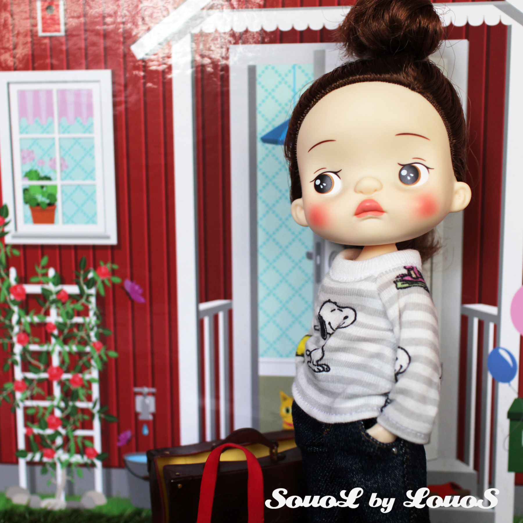 - Raglan top with long sleeves, with Snoopy & Woodstock graphic on front, crew neck collar, closes at back with snap button.