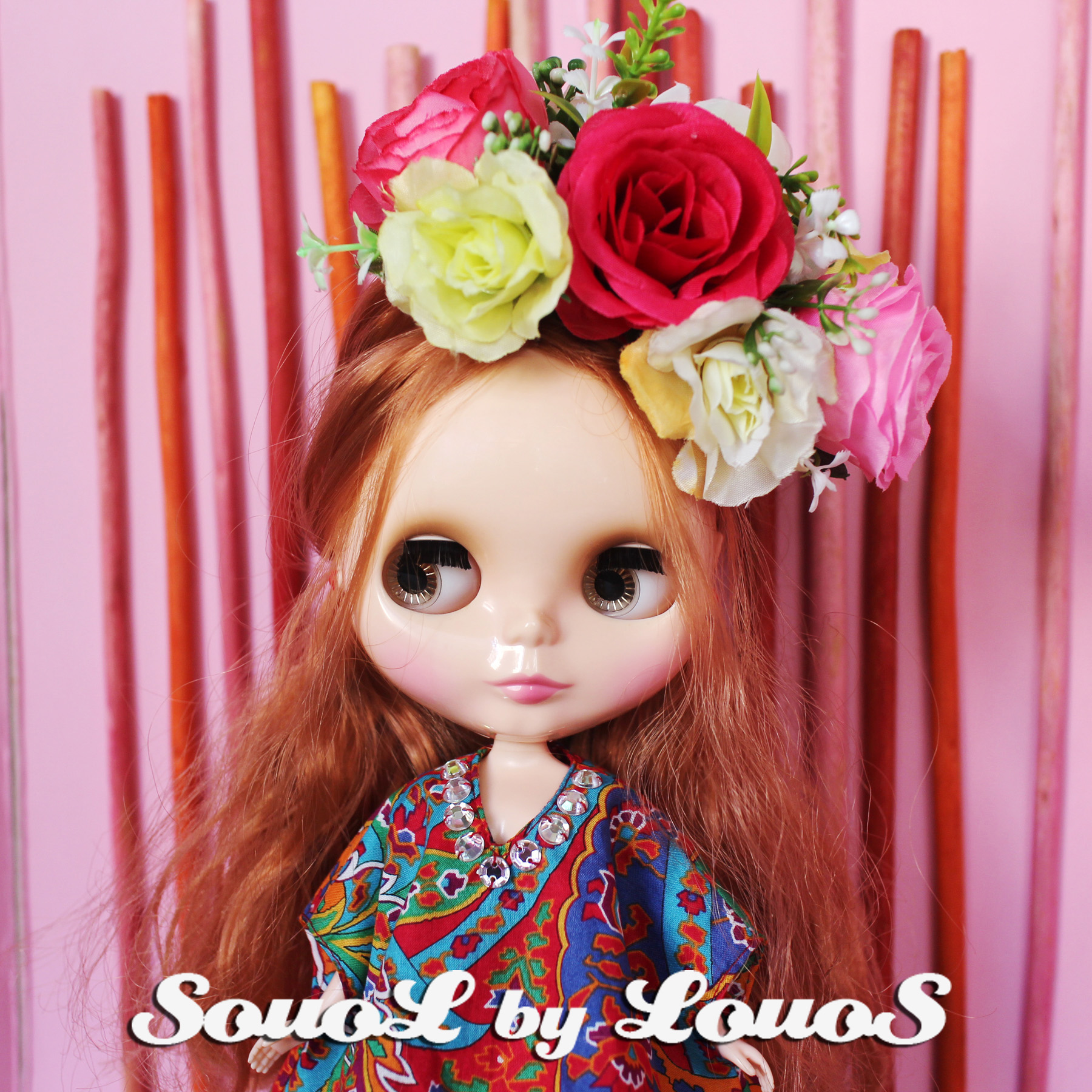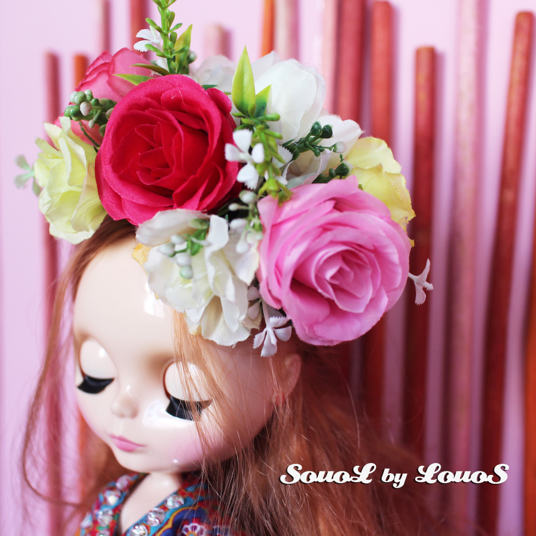 - Flora bouquet headpiece, felt base, attaches to hear with hair clips. Can be clipped onto ribbon as a headband as well.