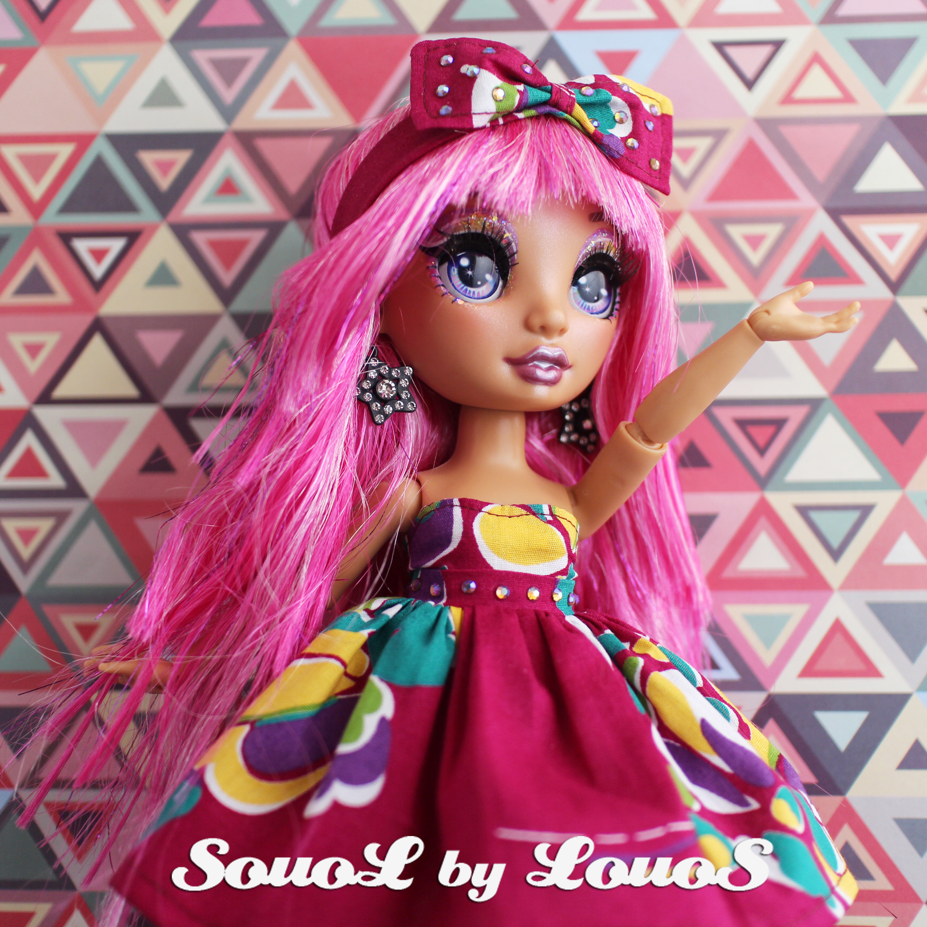 - Strapless dress with heart-shaped bodice, gather skirt, decorated with rhinestones, closes at back with velcro.