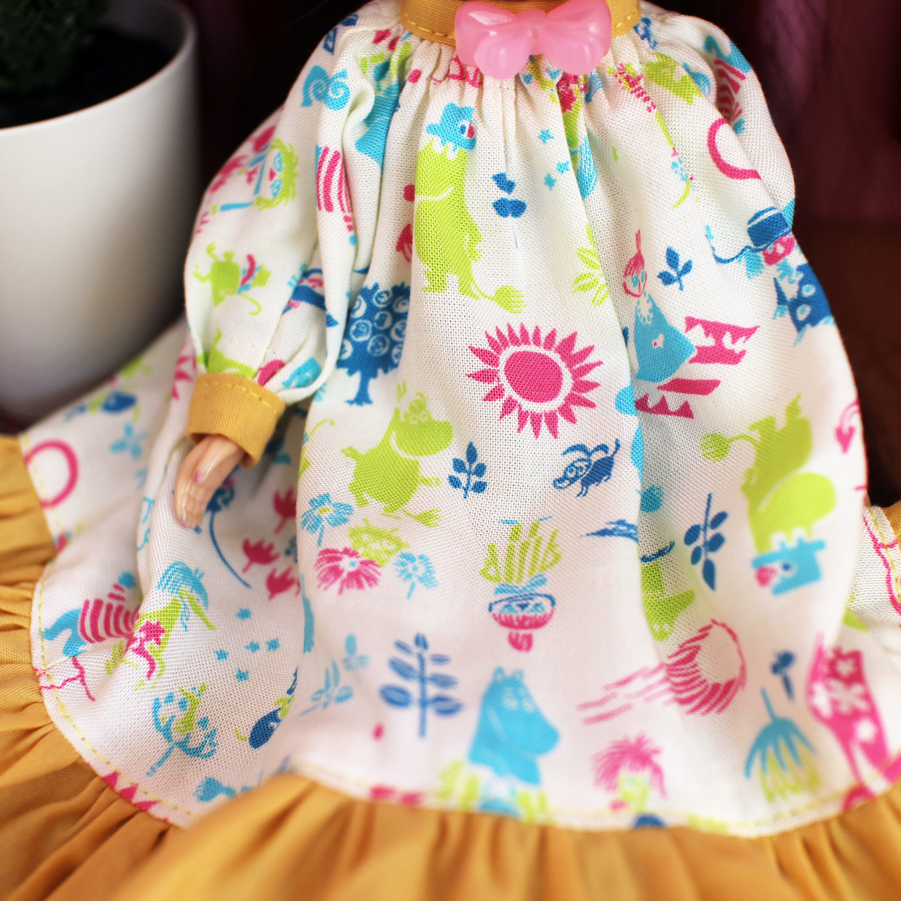 - Moomin print maxi dress with gathers on collar, sleeves and ruffle hem, detailed with bow charm, closes at back with snap button.
