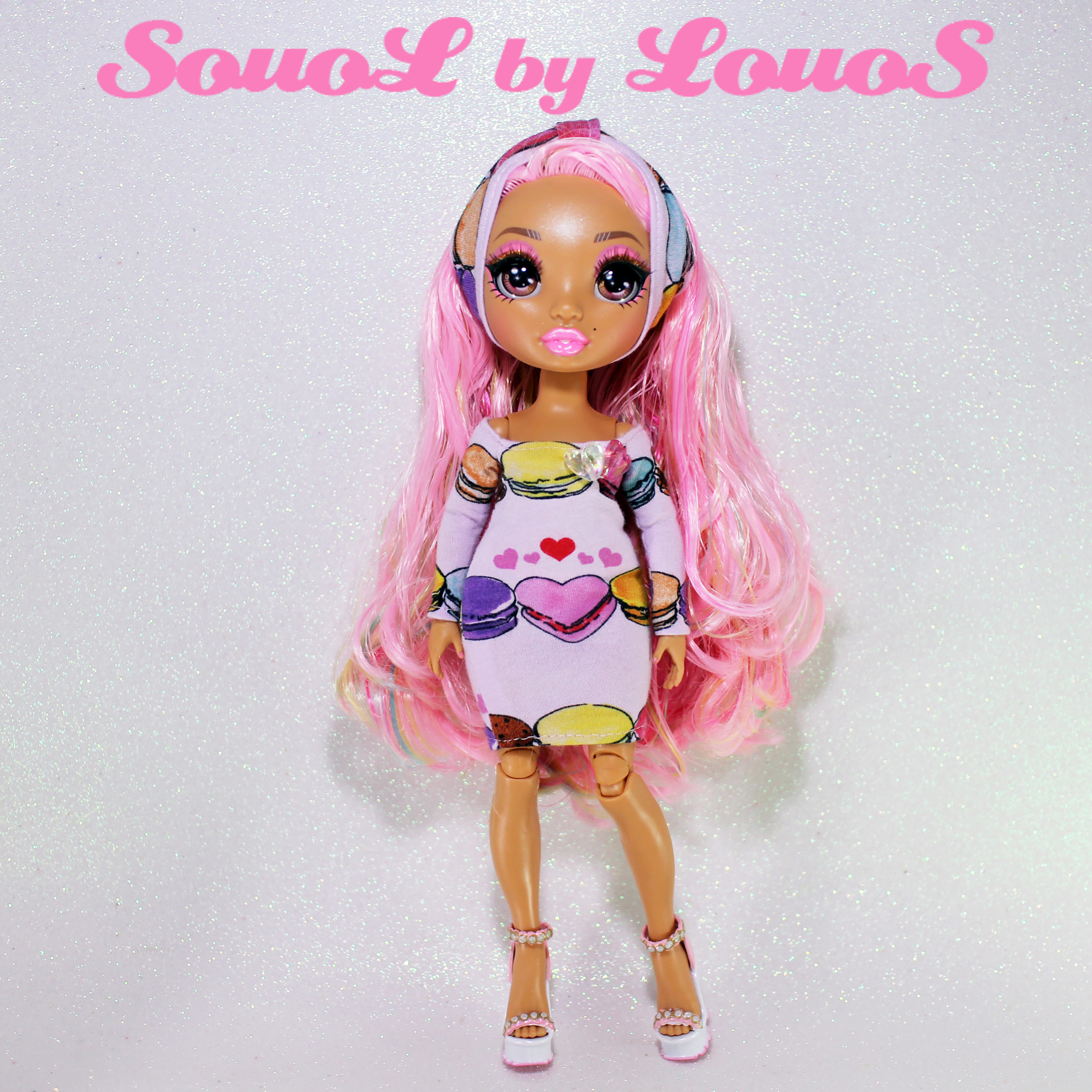 - Ladurée Paris Macaron print off shoulder dress with raglan sleeves, detailed with 2 gem hearts on front bust, worn from bottom.