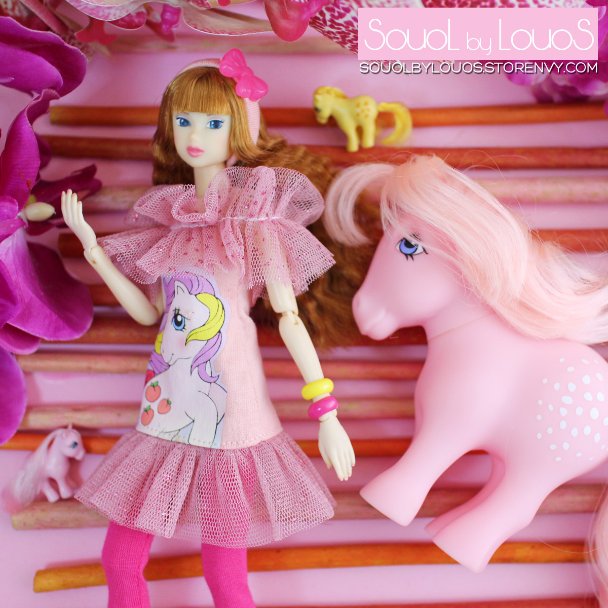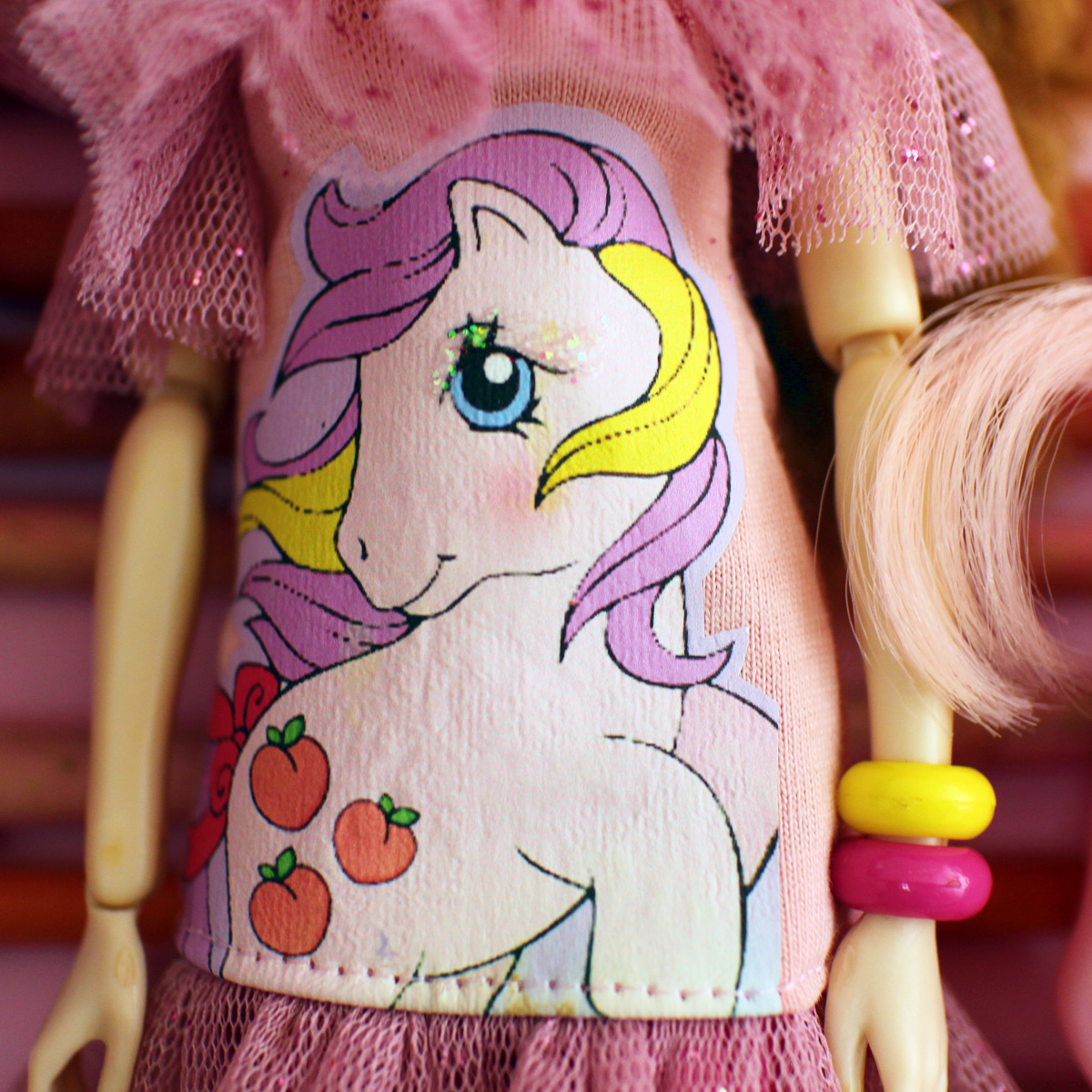 - Tank dress with pony peach cutie mark print, glitter tulle ruffles skirt and attached off shoulder ruffles, closes at back with velcro.