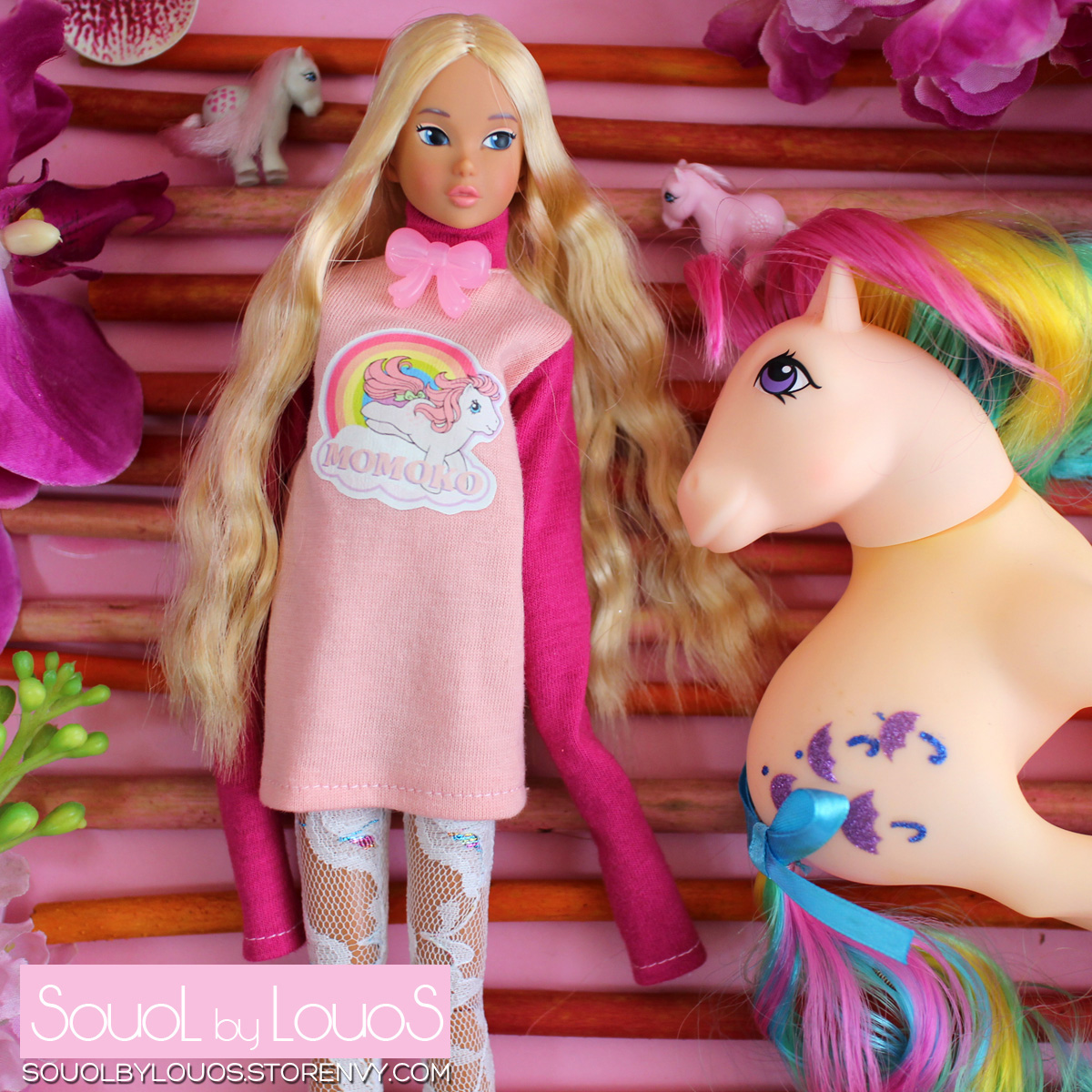 - High collar sweater dress with overlong sleeves, with Momoko Pony print on front, detailed with bow charm, closes at back with velcro.