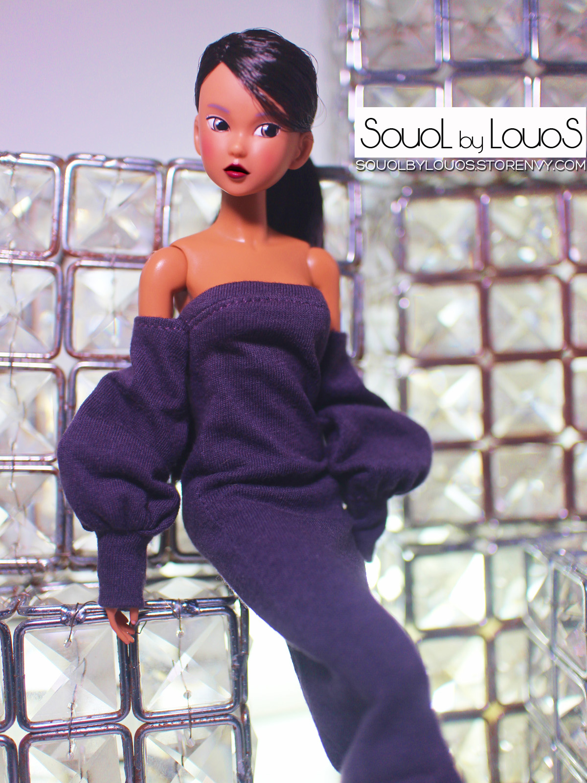 - Jersey tube dress with off shoulder sleeves, worn from bottom.