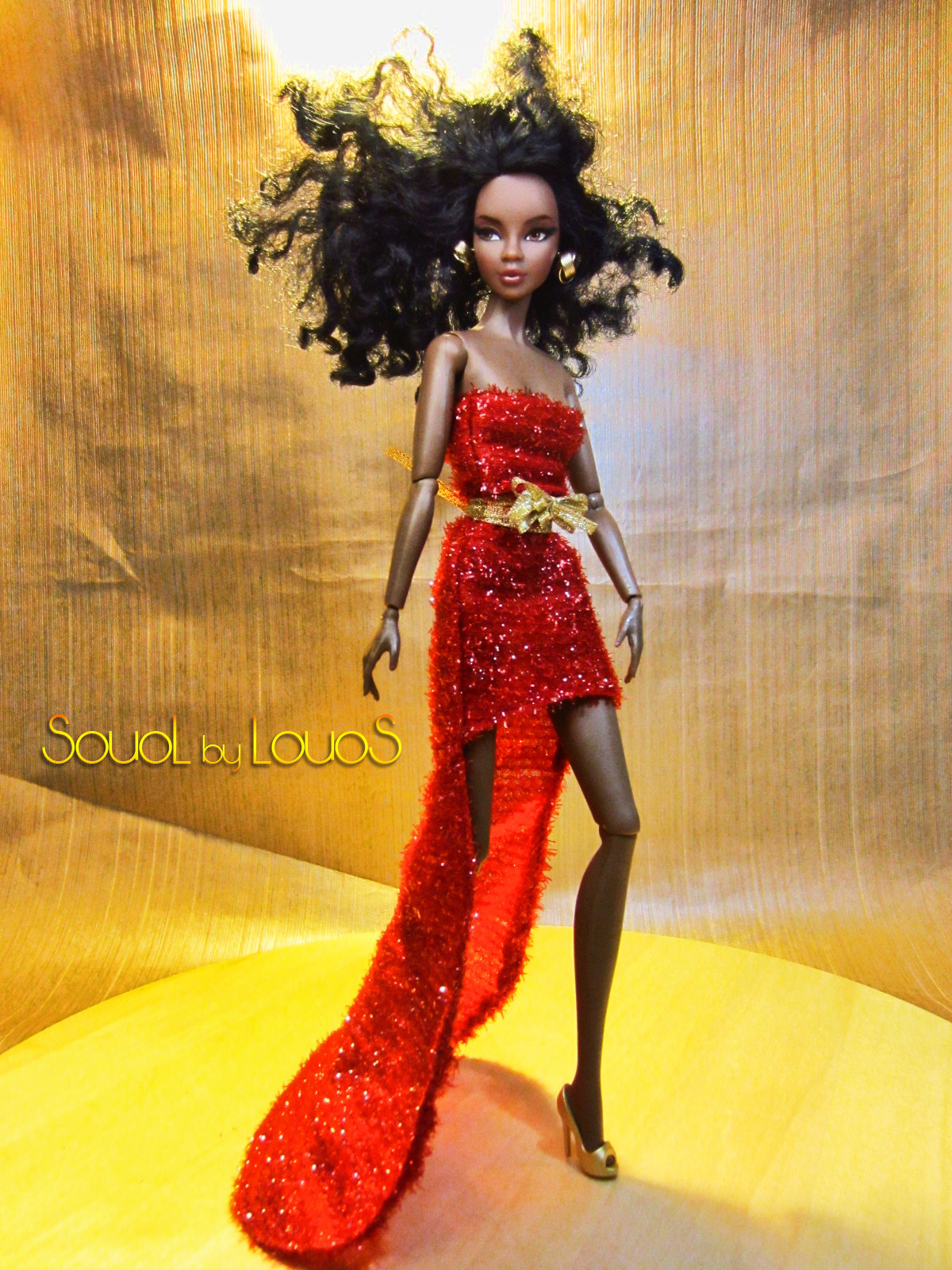 - Red glitter jersey strapless mullet maxi dress, worn from bottom.
